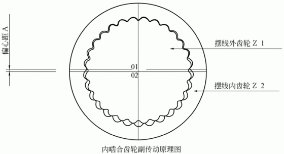 该机采用新型变幅摆线少齿差行星传动原理,将两级内啮合齿轮副齿形设计为互为全包络的变幅摆线等距曲线,实现了由摆线齿轮传动替代摆线针轮传动的重大突破。其传动原理为:Z1与Z2构成高速级齿轮副,替代“针齿轮副”传动减速;Z3与Z4构成低速级齿轮副 ,替代“柱销式输出机构”传动减速;当传动比i=6.5-87时,Z1与Z4构成双联行星齿轮,替代摆线针轮减速机单级单台传动减速;当传动比i=121-10000时,Z1与Z3构成双联行星齿轮,替代摆线针轮减速机两级两台或三级三台传动减速,系一种优质节能型高性价比齿轮减速机。